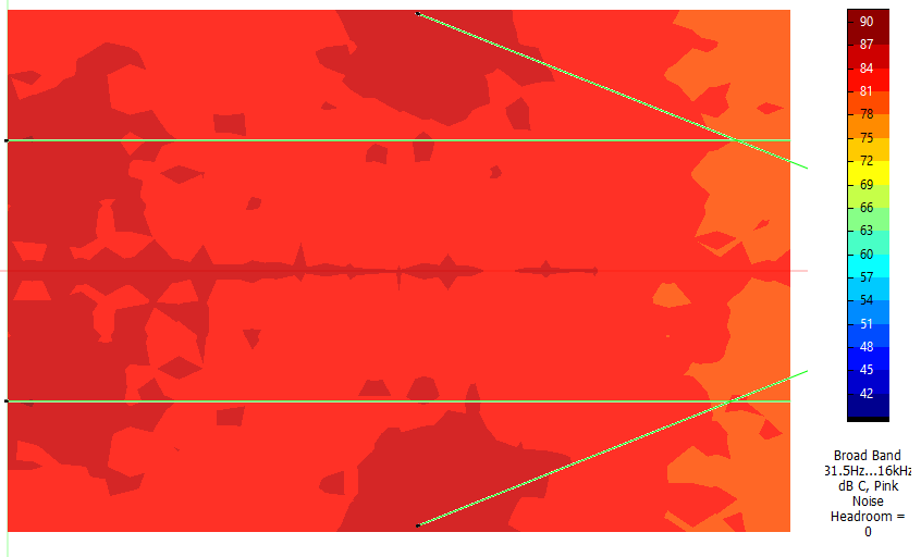 Simulasi menggunakan NS-1, Panjang : 30m, Lebar : 20m, tinggi loudspeaker 1,1m. Rata-rata berbeda sekitar 3dB di area pendengar